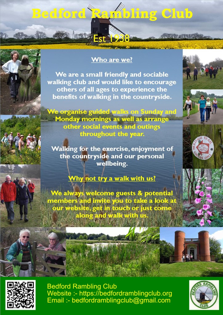 Monday 5th January – Meet at Elstow Abbey car park, Church End, Elstow [same side as the Post Office] for this 4.4 mile walk. We will stop off at John Bunyan’s birthplace. Mainly flat with a few steps to walk up/down. No stiles. Postcode: MK42 9XT W3W: ///weep.skirt.paint Leader: Yve Mobile: 07845522608